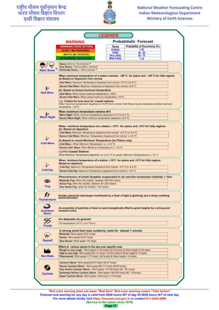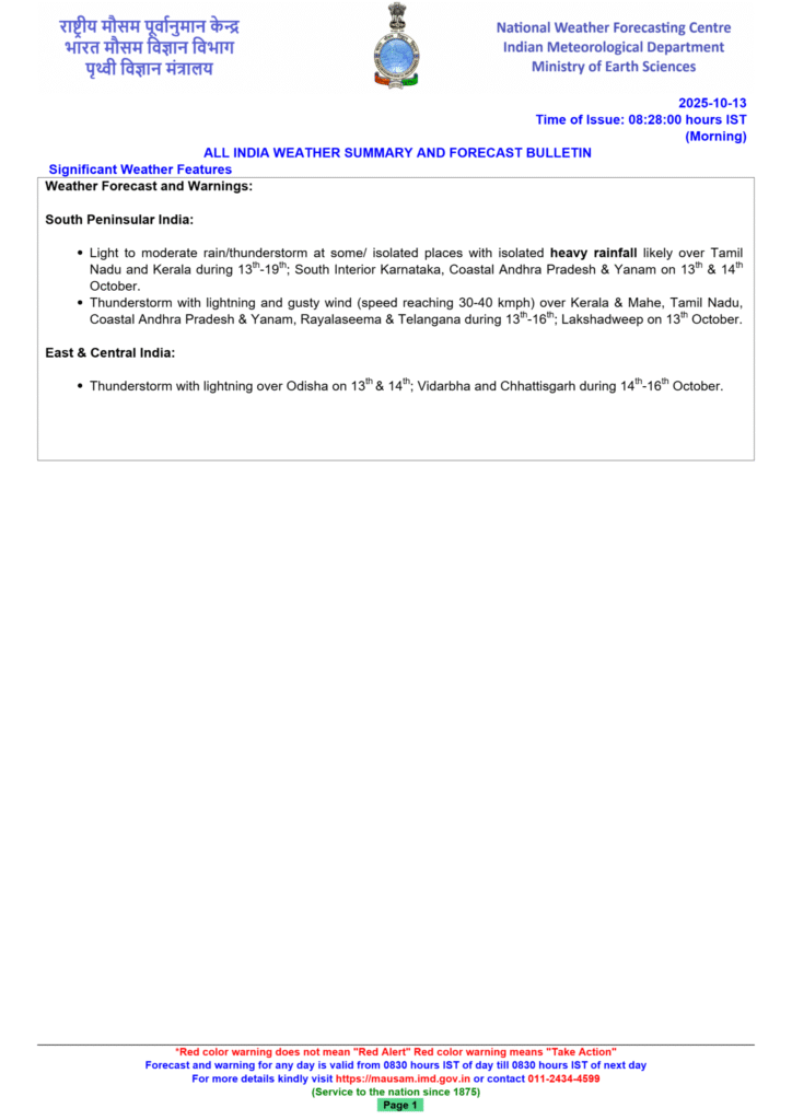 Between October 13 and 16, thunderstorms accompanied by lightning and gusty winds reaching speeds of 30–40 km/h are likely over Kerala, Mahe (in Puducherry), Tamil Nadu, coastal Andhra Pradesh, Yanam, Rayalaseema, and Telangana. Lakshadweep is also expected to experience thunderstorms with gusty winds today, October 13.