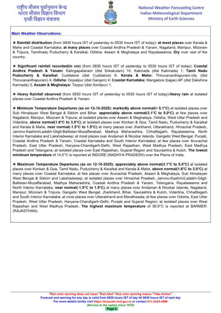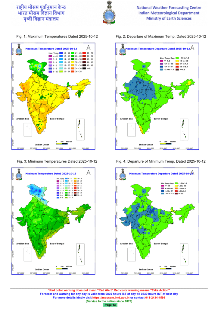 On October 12, minimum temperatures were markedly above normal (more than 5 degrees Celsius) in parts of sub-Himalayan West Bengal, Sikkim, and Bihar, while being above normal (3–5 degrees Celsius higher) in regions such as Assam, Meghalaya, Nagaland, Manipur, Mizoram, Tripura, Odisha, Uttar Pradesh, and Vidarbha region.