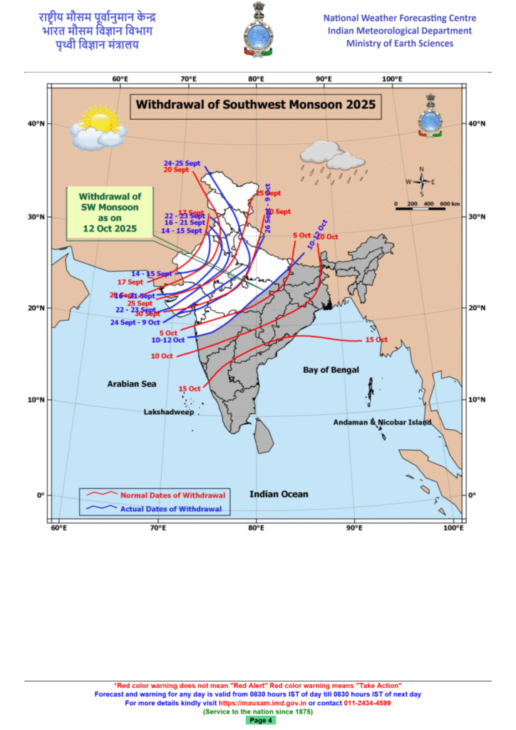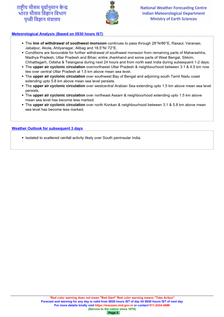 The bulletin, issued at 8:02 PM on Sunday, also indicates that the southwest monsoon withdrawal process is underway from most parts of central and eastern India, even as the southern peninsular region remains under the influence of multiple weather systems. Residents and travellers are advised to plan their immediate travel plans keeping the current forecast in mind. In tricky areas, avoid unnecessary travel if possible.