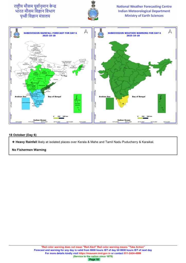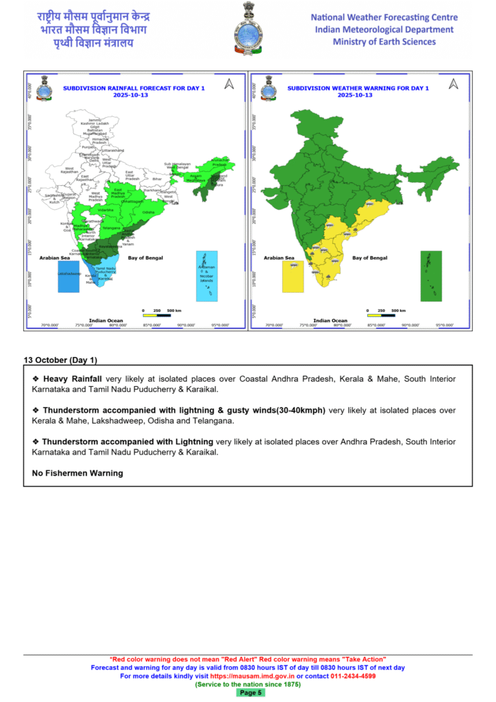 In its day-wise forecast, the IMD has warned of heavy rainfall and thunderstorms over isolated places in Kerala, Tamil Nadu, and Andhra Pradesh from October 13–18, while Telangana and Karnataka may see thunderstorms accompanied by lightning. There are, however, no warnings in place for fishermen during this period.
