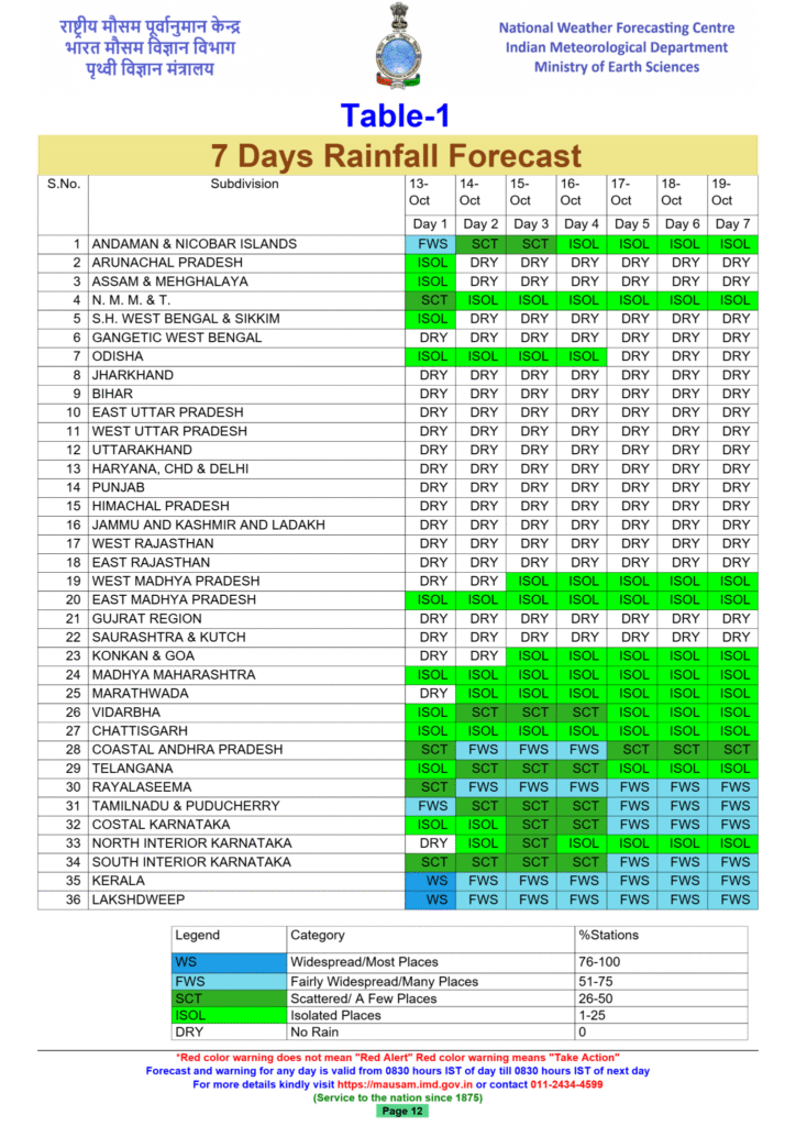 The IMD’s seven-day forecast (October 12–18) suggests that rainfall will remain concentrated over southern India, while most other regions are expected to stay dry.
