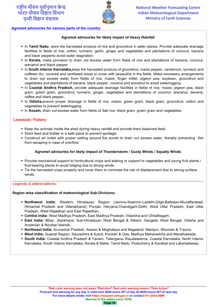 • Tamil Nadu, Puducherry and Karaikal: Fairly widespread rainfall is expected between October 13–18.