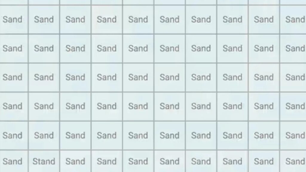 So, are you ready to take the challenge? Okay, before starting the challenge, let’s briefly review the image. This image is a fun visual brain teaser puzzle with a given sequence of “Sand” puzzles. At first glance, they all look very similar. But there’s a hidden “Stand,” which is an odd word among the “Sand” series word Puzzle. The challenge is to find the odd word “Stand” among the “Sand” sequence series Word puzzle Brain Teaser. So, are you ready to check your super-visionary eye-skill? Then, find the word “Stand” in this word puzzle brain teaser of “Sand” in just 8 seconds.