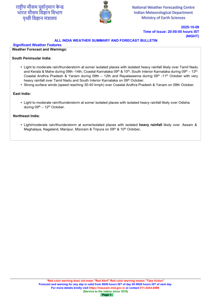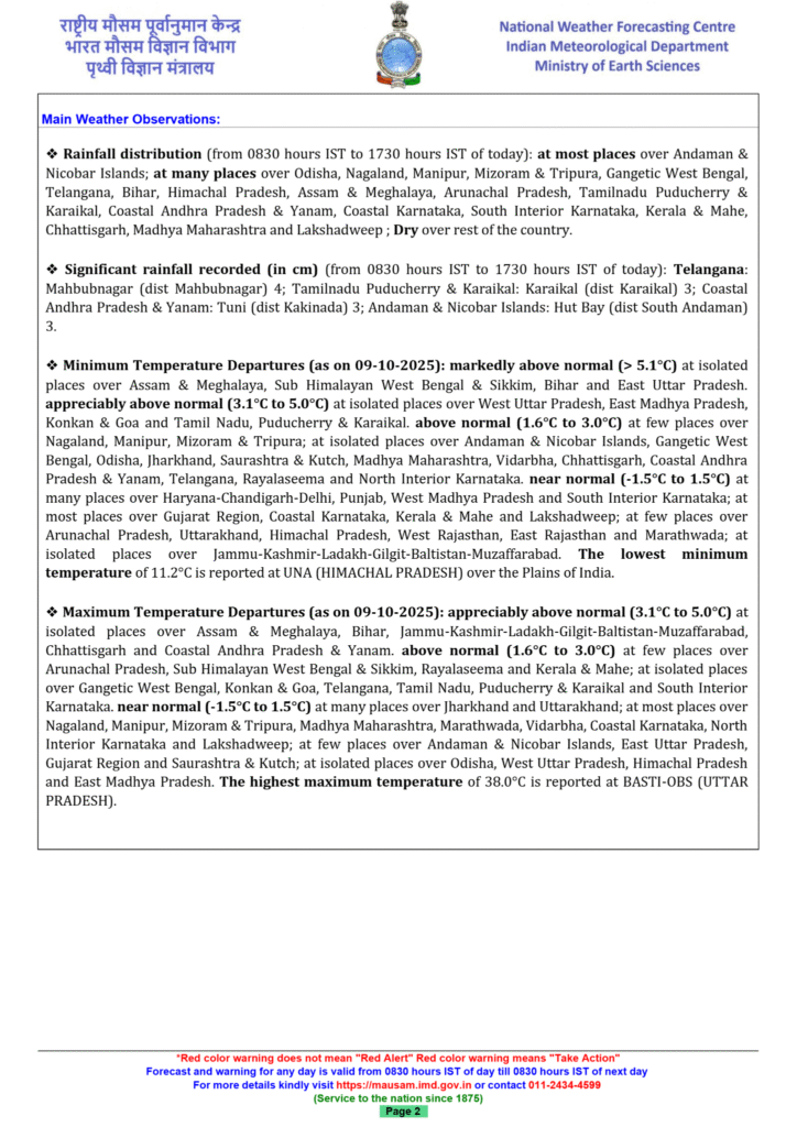 - Northeast India: Isolated heavy rainfall is likely in Assam, Meghalaya, Nagaland, Manipur, Mizoram, and Tripura on October 10.