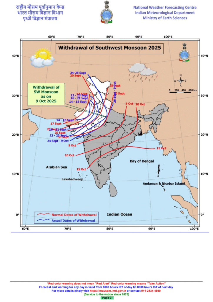 - Progress of withdrawal: The monsoon’s retreat is advancing across Gujarat, Madhya Pradesh, Uttar Pradesh, and parts of Maharashtra.