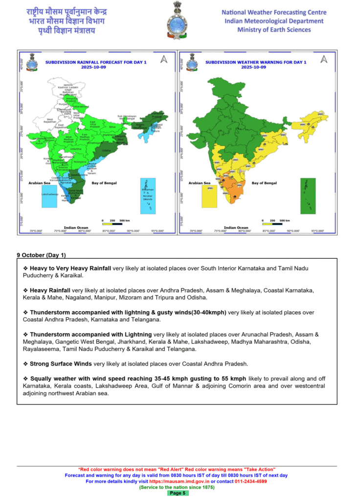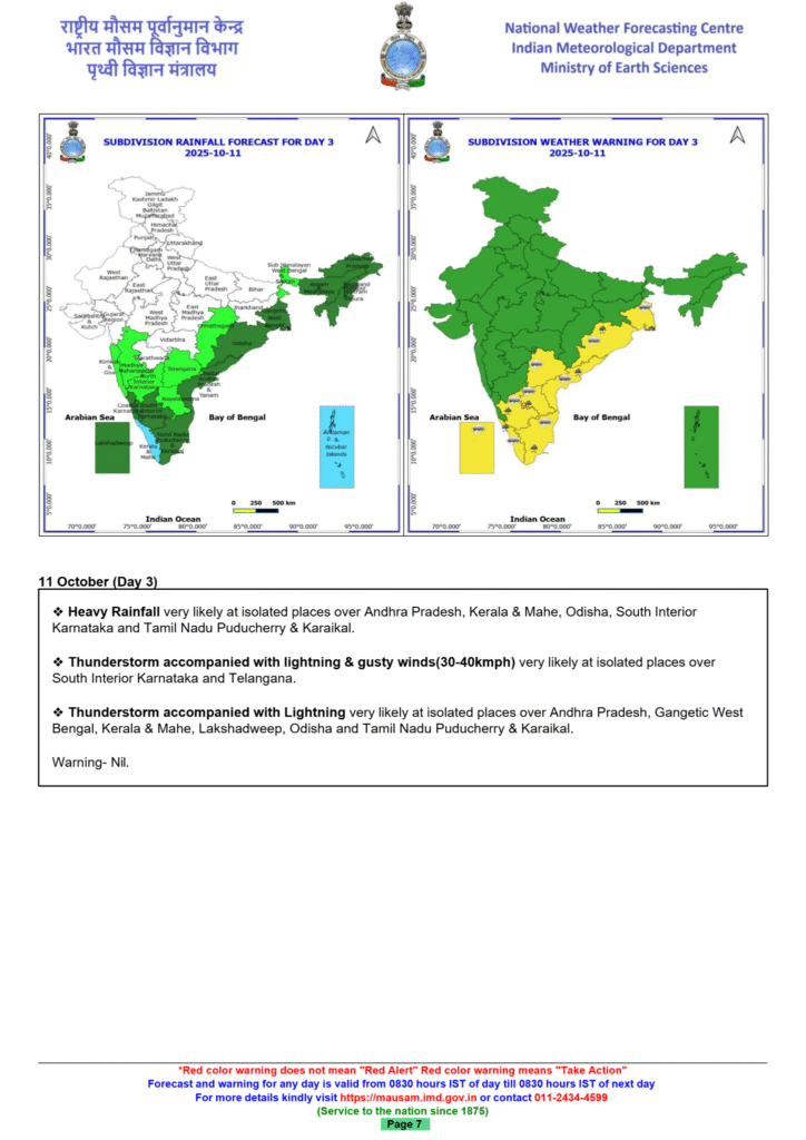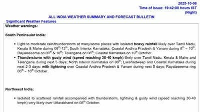 - Andhra Pradesh and Yanam: Expected to experience light to moderate rain with isolated heavy rainfall through October 12. Thunderstorms with lightning and gusty winds are also likely.