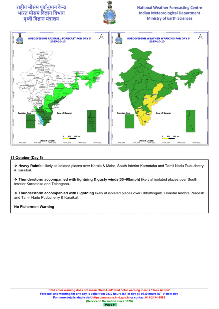 - Tamil Nadu, Puducherry, and Karaikal: The region will see isolated heavy rainfall through October 14.