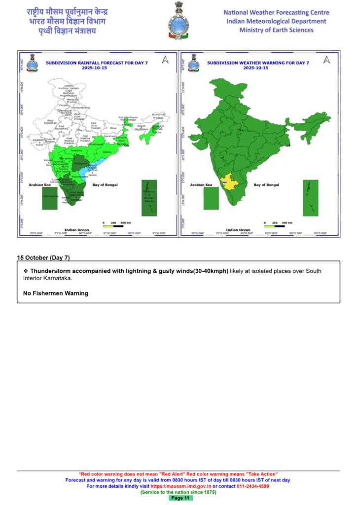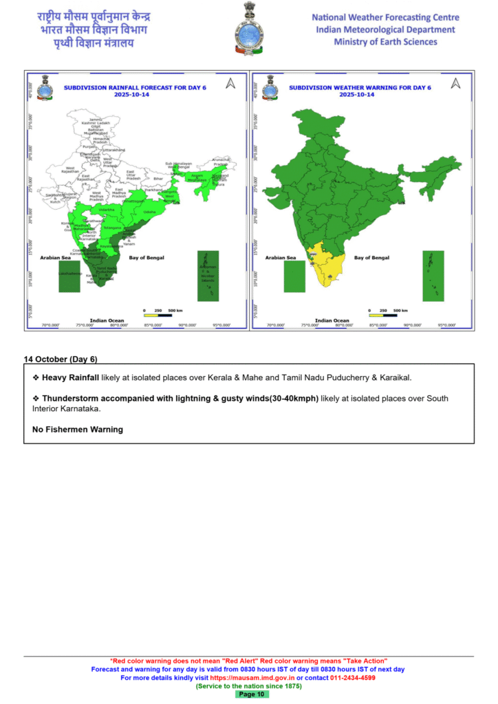 - Kerala and Mahe: Isolated heavy rainfall is forecast to continue through October 14.