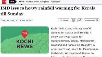 The IMD issued a yellow alert in Kerala for many districts, including Pathanamthitta, Idukki, Malappuram, Wayanad, and Kannur on Thursday, predicting heavy showers. For the period of October 9–12, the state is expected to experience light to moderate rainfall and thunderstorms, with isolated areas receiving heavy rainfall.