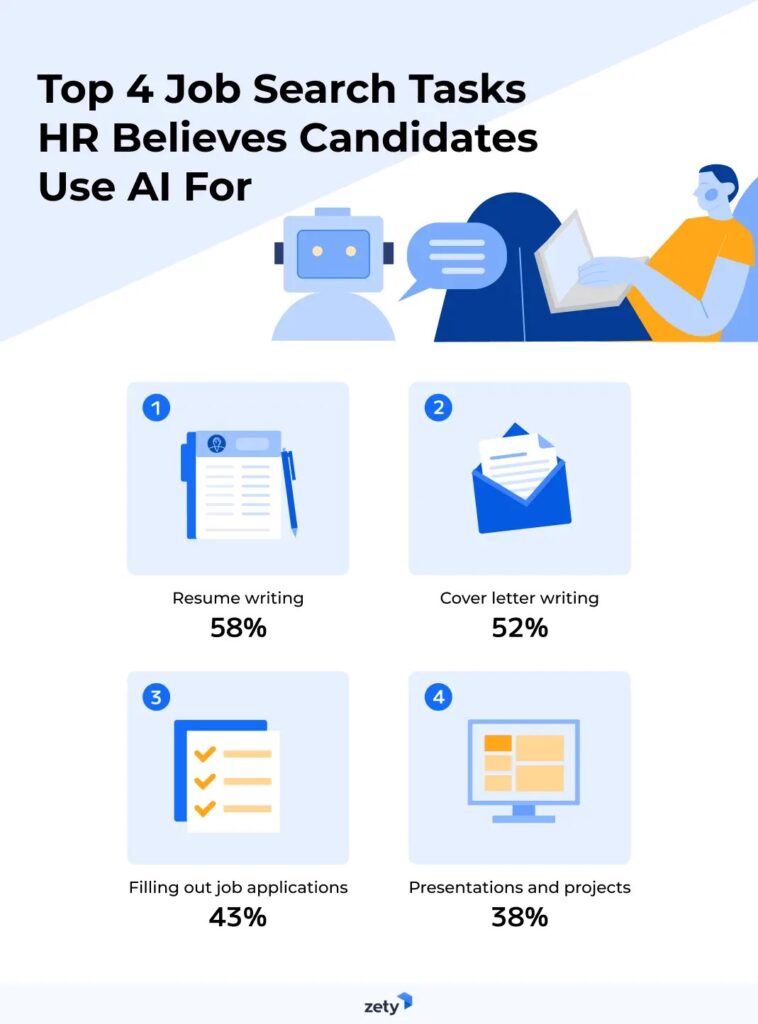 In today’s rapidly evolving job market, integrating artificial intelligence in the application process is gaining significant traction. According to Zety’s study, the majority of HR professionals approve of candidates leveraging AI for essential job search tasks, including: