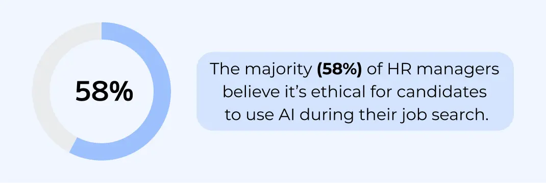 However, opinions on the ethics of using AI remain divided. While 58% of HR managers believe it’s ethical for candidates to utilize AI during their job search, 42% still consider it unethical.