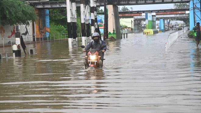Cyclone Montha, which developed from a cyclonic system over the south-eastern Bay of Bengal on October 27, 2025, has now hit the Andhra Pradesh coast. According to the India Meteorological Department (IMD), the storm crossed Andhra Pradesh and Yanam coasts on the night of October 28, 2025, during which the wind speed was 90-100 kilometers per hour. A lone motorcyclist wading through a water-logged road, as many people stayed indoors due to continuous rain and strong winds, in Vijayawada on October 29, 2025. | Photo Credit: K.V.S. Giri